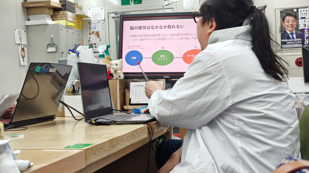 講座では、日々の生活の中で取り入れやすいケア方法として、眼精疲労の対策や香りを使ったリラックス方法、そしてマインドフルネスについてご紹介しました。参加された皆さんも、実践を交えながらセルフケアの大切さについて理解を深めている様子でした。