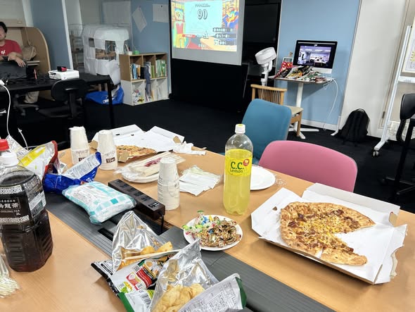 打ち上げでは、絵本制作の苦労話や楽しかったエピソードを語り合いながら、ピザを食べたり、ゲームなども楽しむ和やかなひとときとなりました。