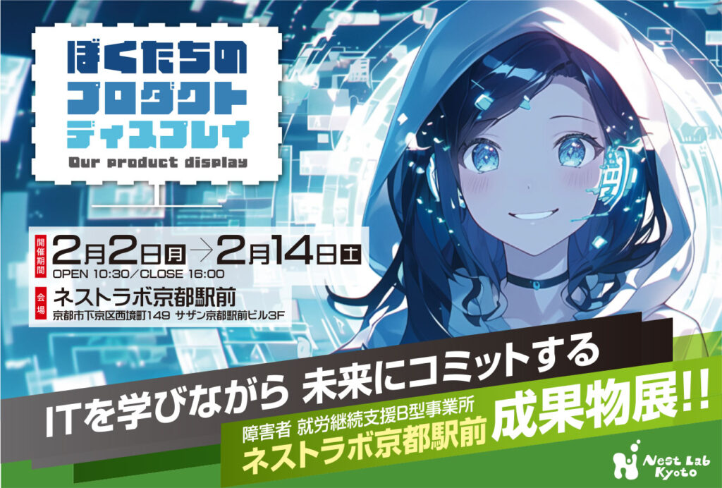 2周年企画として、この1年利用者さんと取り組んできたプロジェクトやお仕事、訓練の成果物を展示し、ネストラボ京都駅前の活動を皆様に広く知って頂けるイベントを開催いたします。